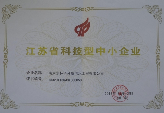 2014年1月23日,南京水杯子分質(zhì)供水工程有限公司獲得“江蘇省科技型中小企業(yè)”稱號(hào),并取得證書。